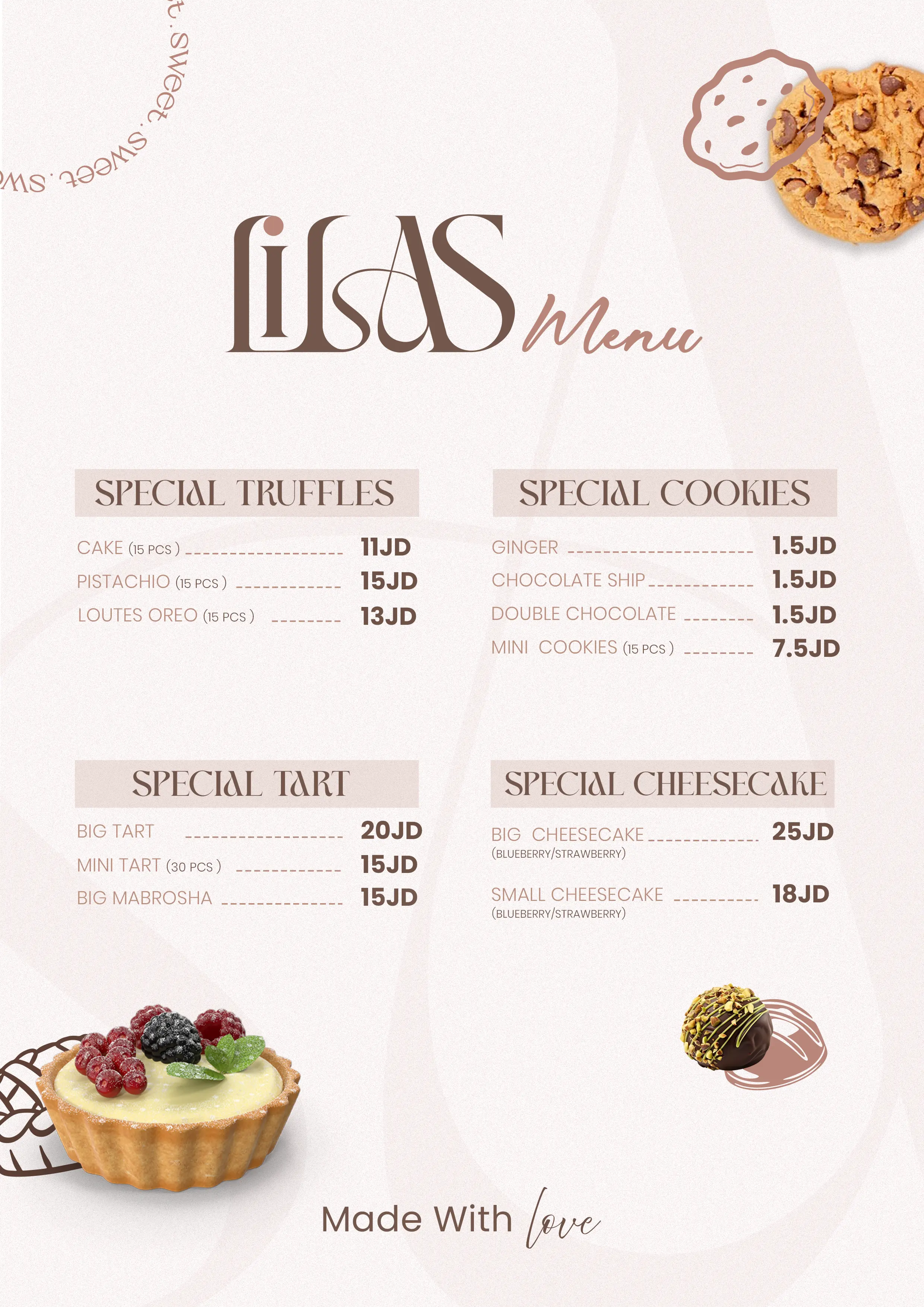 تشكيلة حلويات فاخرة، ألوان هاديّة، وطعم يضلّ بالذاكرة. بوكسات مناسبات، ضيافة، وترتيبات خاصة تنحجز بخطوة بسيطة.
